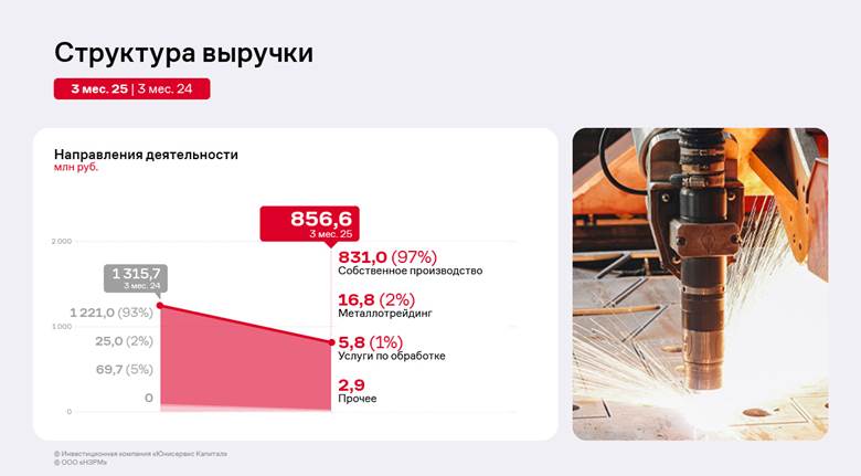 По итогам 1 квартала 2025 г. структура выручки ООО «НЗРМ» практически не изменилась относительно прошлых периодов. Изготовление и реализация продукции собственного производства по-прежнему остаётся ключевым направлением деятельности, доля которого составляет 97%. Представители эмитента отмечают, что спрос на продукцию завода со стороны горнодобывающей, энергетической и прочих отраслей остаётся стабильным, а со стороны вагоностроительных компаний снизился. Ранее наличие предпосылок к сокращению производства грузовых вагонов в России отмечал союз «Объединение вагоностроителей», связывая их с борьбой ОАО «РЖД» с профицитом подвижного состава на сети, ограничениями пропускной способности инфраструктуры, низкими объёмами списания вагонов. В связи с гибкостью производства и сотрудничеством с представителями разных отраслей заказы от вагоностроительных компаний были замещены другими клиентами. Например, предприятиями, которые занимаются закупом комплектующих для сферы сельского хозяйства. Дополнительно эмитент занимается металлотрейдингом, а также оказывает услуги по металлообработке.
